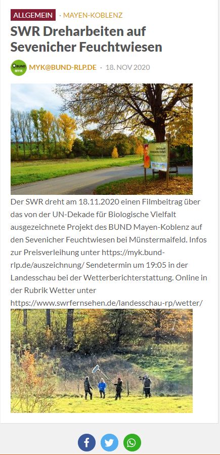 SWR Fernsehbericht: Landesschau RLP 18.11.2020, Link: Sevenicher Feuchtwiesen dienen Hochwasserschutz